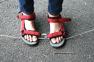 Auch die Breite kann variiert werden, indem die Beine weiter oder enger gestellt werden oder das Gummiband sogar nur um einen Fuß gedehnt wird.