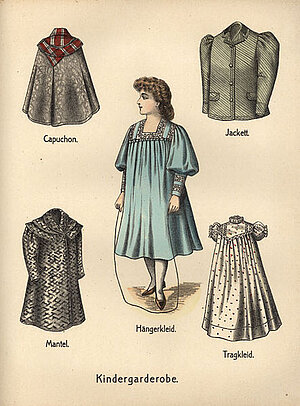 Mädchen trugen meist dunkle Kleider und dazu dunkle Strümpfe. Doch wie in der Frauenmode gab es auch Kleider mit Spitzen und Rüschen, wenn man sich herausputzte. Weiße Söckchen zierten die Knöchel der Jüngsten, überhaupt war Weiß neben Schwarz eine wichtige Farbe. Warum? Weiß ist die Farbe der Reinheit und der Kindheit, zeigt aber gleichzeitig auch Reichtum. Wer konnte sich das Waschen von weißen Kleidern leisten? Die Kleidung der ärmeren Kinder sah oft wochenlang keinen Waschzuber, man hatte keine große Auswahl und die Hauptfarbe war hier wohl irgendwann ein Grau. Wer weiß trug, durfte weder spielen noch sich schmutzig machen.