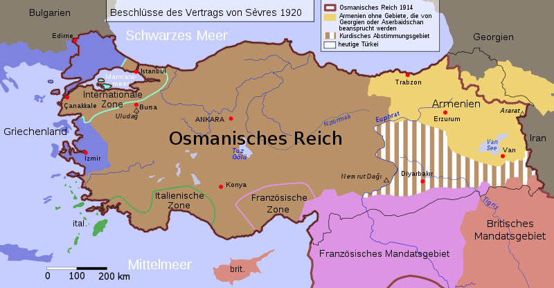 Den Vertrag von Sèvres schloss man am 10. August 1920 mit dem Osmanischen Reich. Es sollte ebenfalls große Gebiete abtreten. Es kam zu heftigen Widerständen in Ankara. Der Türkische Befreiungskrieg begann. 1923 wurde der Vertrag zugunsten der inzwischen gegründeten Türkei geändert (siehe dazu auch: Griechenland und Türkei).